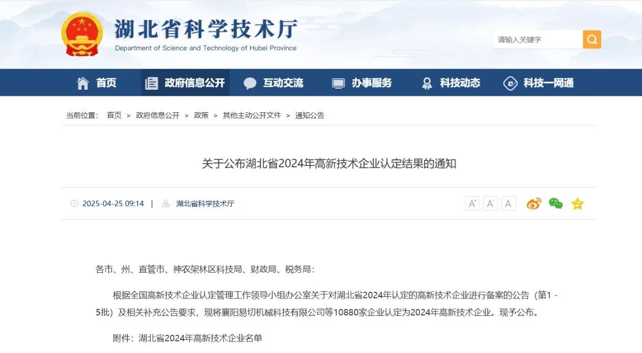 4月25日,湖北省科技廳公布湖北省2024年高新技術企業認定結果,武漢鼎業安環科技集團有限公司入選湖北省2024年高新技術企業名單。