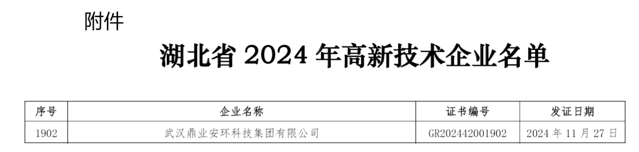 武漢鼎業安環科技集團榮獲湖北省2024年高新技術企業證書!