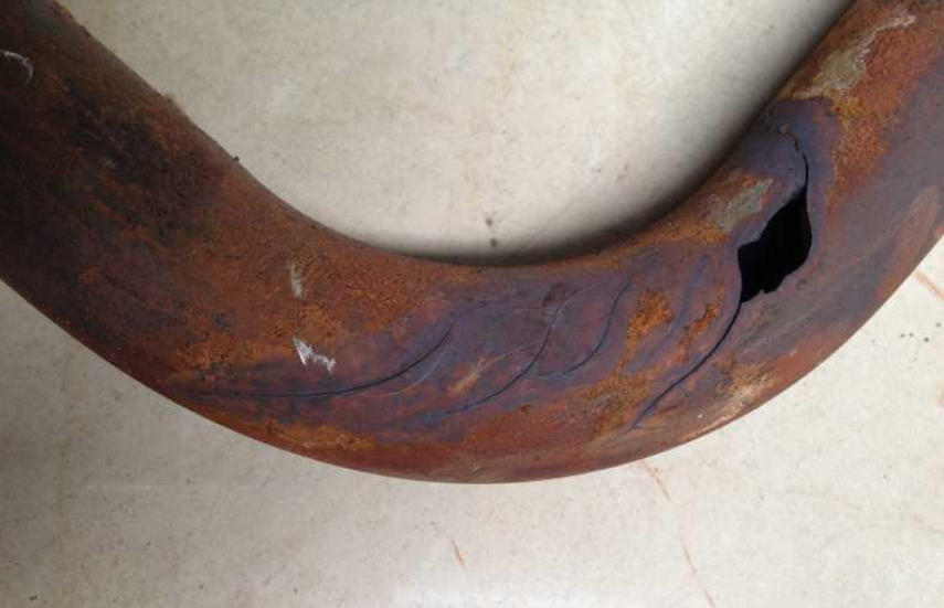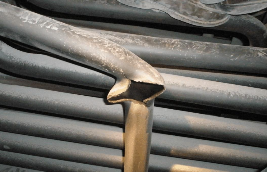 2.磨損:磨損爆管特征為管壁減薄呈刀刃狀、表面平滑、金相不變、管徑無(wú)變化。主要分為吹灰器蒸汽吹損(如內(nèi)漏、不旋轉(zhuǎn)等)、機(jī)械磨損(管卡松動(dòng)等造成金屬間粘著磨損)及煙氣飛灰磨損(對(duì)流受熱面尤其是尾部煙道中灰粉顆粒沖刷)。