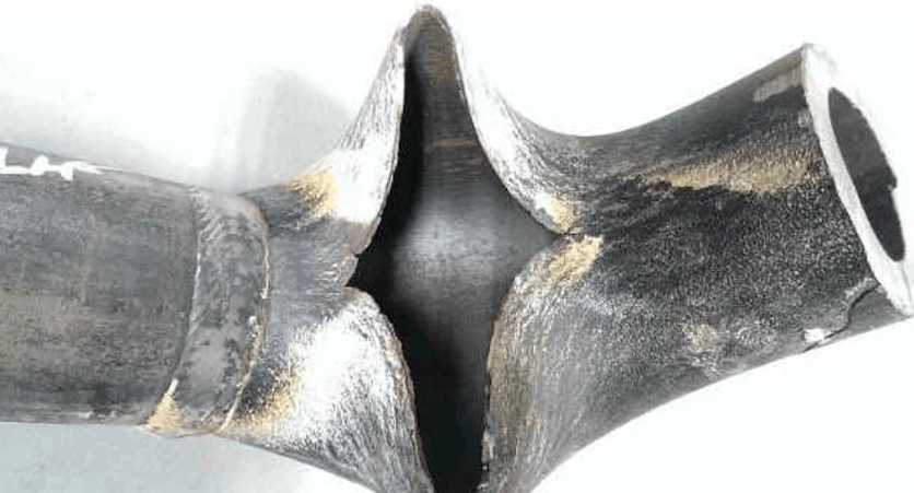 1.超溫過(guò)熱:短期超溫過(guò)熱是管壁溫度超材料下臨界溫度,強(qiáng)度下降后在內(nèi)壓作用下脹粗爆管,特征為管徑脹粗、管壁減薄呈刀刃狀、爆口大且周圍硬度高;長(zhǎng)期超溫過(guò)熱是管壁溫度長(zhǎng)期超設(shè)計(jì)溫度,力學(xué)性能惡化后脆裂,特征為管徑無(wú)明顯變化、爆口小呈顆粒狀且周圍有氧化皮。